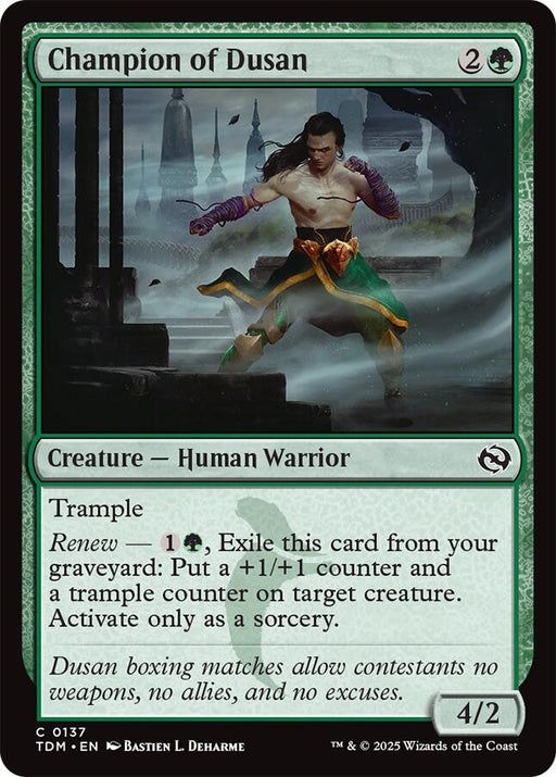 Tarkir: DragonstormRarity: C #: 137 Creature Type or Sub Type: Creature — Human Warrior P: 4 T: 2 Rules Text Contains: Trample Renew — 1G, Exile this card fro...