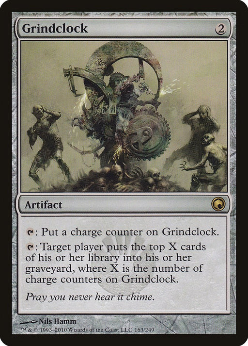 Scars of MirrodinRarity: R #: 163 Creature Type or Sub Type: Artifact Rules Text Contains: T: Put a charge counter on Grindclock. T: Target player puts the ...
