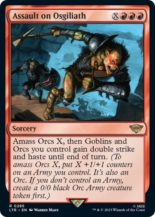Universes Beyond: The Lord of the Rings: Tales of Middle-earthRarity: R #: 285 Creature Type or Sub Type: Sorcery Rules Text Contains: Amass Orcs X, then Goblins and Orcs you control gain double strike an...