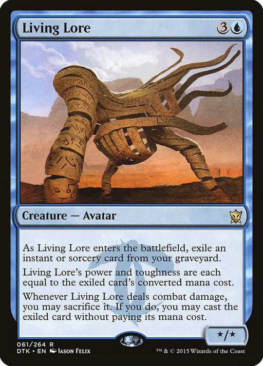 Dragons of TarkirRarity: R #: 61 Creature Type or Sub Type: Creature — Avatar P: * T: * Rules Text Contains: As Living Lore enters the battlefield, exile an ...