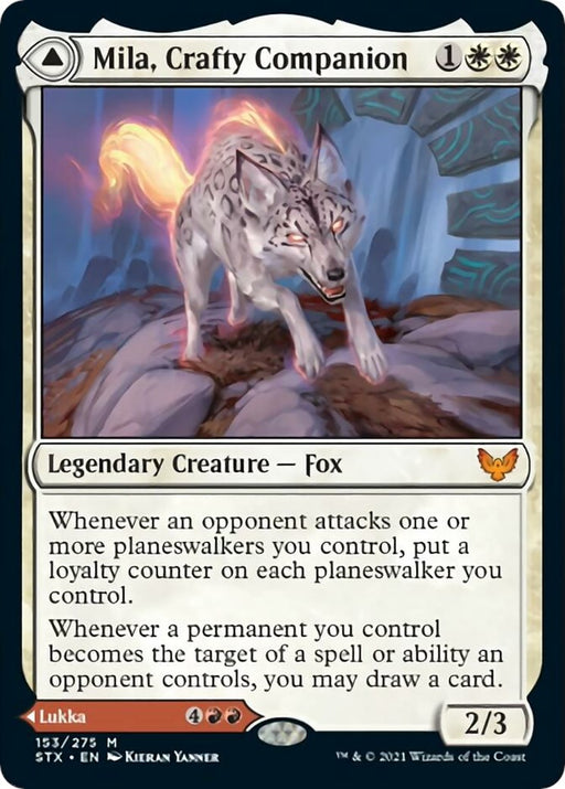 Strixhaven: School of MagesRarity: M #: 153 Creature Type or Sub Type: Legendary Creature — Fox // Legendary Planeswalker — Lukka P: 2 T: 3 Rules Text Contains: Mila, ...