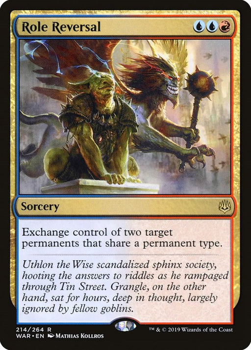 War of the SparkRarity: R #: 214 Creature Type or Sub Type: Sorcery Rules Text Contains: Exchange control of two target permanents that share a permanent type...