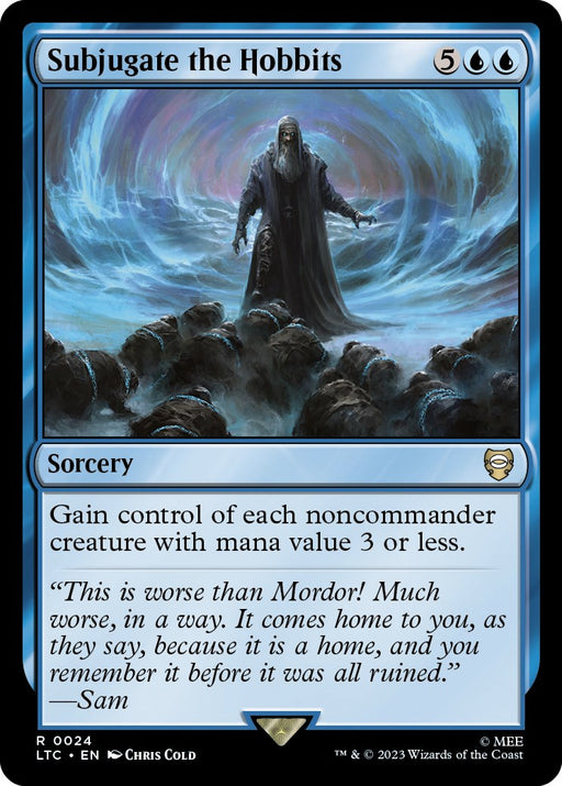 Commander: The Lord of the Rings: Tales of Middle-earthRarity: R #: 24 Creature Type or Sub Type: Sorcery Rules Text Contains: Gain control of each noncommander creature with mana value 3 or less.