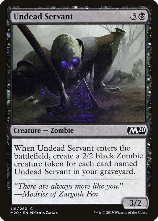 Core Set 2020Rarity: C #: 118 Creature Type or Sub Type: Creature — Zombie P: 3 T: 2 Rules Text Contains: When Undead Servant enters the battlefield, cre...