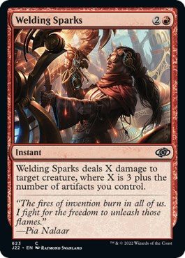 Jumpstart 2022Rarity: C #: 623 Creature Type or Sub Type: Instant Rules Text Contains: Welding Sparks deals X damage to target creature, where X is 3 plus t...