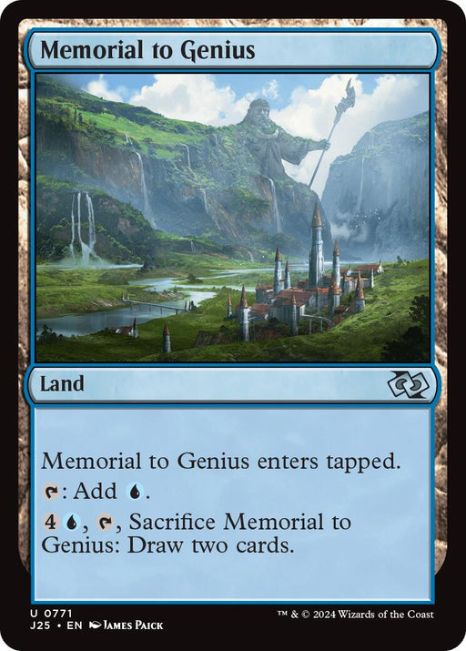 Foundations JumpstartRarity: U #: 771 Creature Type or Sub Type: Land Rules Text Contains: Memorial to Genius enters tapped. T: Add U. 4U, T, Sacrifice Memor...