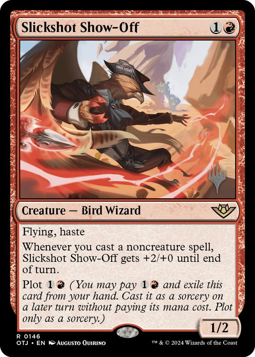 Promo Pack: Outlaws of Thunder JunctionRarity: R #: 146 Creature Type or Sub Type: Creature — Bird Wizard P: 1 T: 2 Rules Text Contains: Flying, haste Whenever you cast a n...