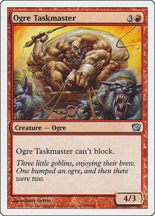 9th EditionRarity: U #: 205 Creature Type or Sub Type: Creature — Ogre P: 4 T: 3 Rules Text Contains: Ogre Taskmaster can’t block. Flavor: Three littl...