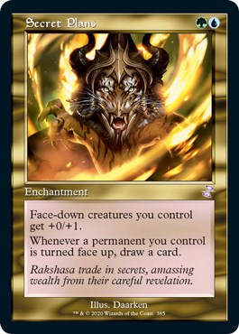 Time Spiral: RemasteredRarity: S #: 385 Creature Type or Sub Type: Enchantment Rules Text Contains: Face-down creatures you control get +0/+1. Whenever a permanent ...