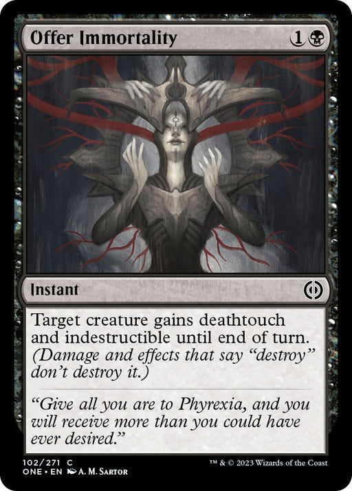 Phyrexia: All Will Be OneRarity: C #: 102 Creature Type or Sub Type: Instant Rules Text Contains: Target creature gains deathtouch and indestructible until end of turn...