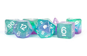 From our legendary kickstarter, unicorn dice are a beautiful mix of transparent resins, which are then infused with prismatic glitter dust that changes from blues to purples to greens as it hits the light. Each 16mm polyhedral set comes with 7 dice (d4, d6, d8, d10, d10 (00-90), d12, and d20).