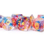 From our legendary kickstarter, unicorn dice are a beautiful mix of transparent resins, which are then infused with prismatic glitter dust that changes from blues to purples to greens as it hits the light. Each 16mm polyhedral set comes with 7 dice (d4, d6, d8, d10, d10 (00-90), d12, and d20).