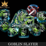 Note: This is a layered dice set. Each shape contains a Tiny Goblin Head with Sword resting on the blue base layer. The inclusion is made of resin and will not bias the dice rolls to a noticeable degree.