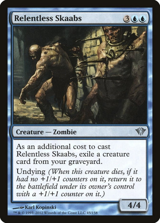 Dark AscensionRarity: U #: 45 Creature Type or Sub Type: Creature — Zombie P: 4 T: 4 Rules Text Contains: As an additional cost to cast Relentless Skaabs,...