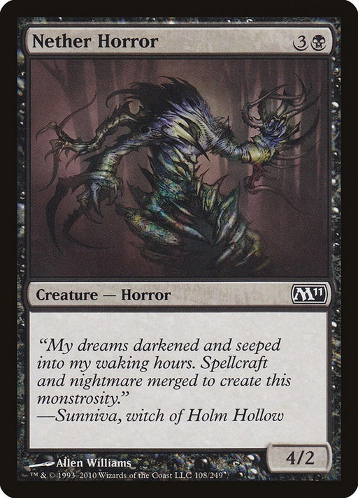 Magic 2011 (M11)Rarity: C #: 108 Creature Type or Sub Type: Creature — Horror P: 4 T: 2 Flavor: <em>“My dreams darkened and seeped into my waking hour...