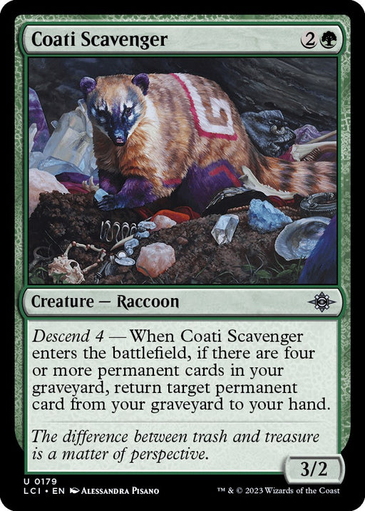 The Lost Caverns of IxalanRarity: U #: 179 Creature Type or Sub Type: Creature — Raccoon P: 3 T: 2 Rules Text Contains: Descend 4 — When Coati Scavenger enters the ba...