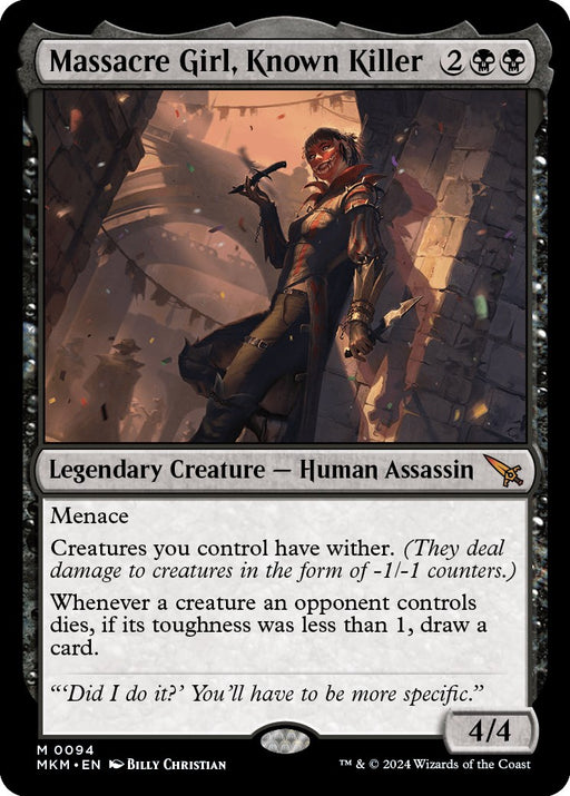 Murders at Karlov ManorRarity: M #: 94 Creature Type or Sub Type: Legendary Creature — Human Assassin P: 4 T: 4 Rules Text Contains: Menace Creatures you contro...